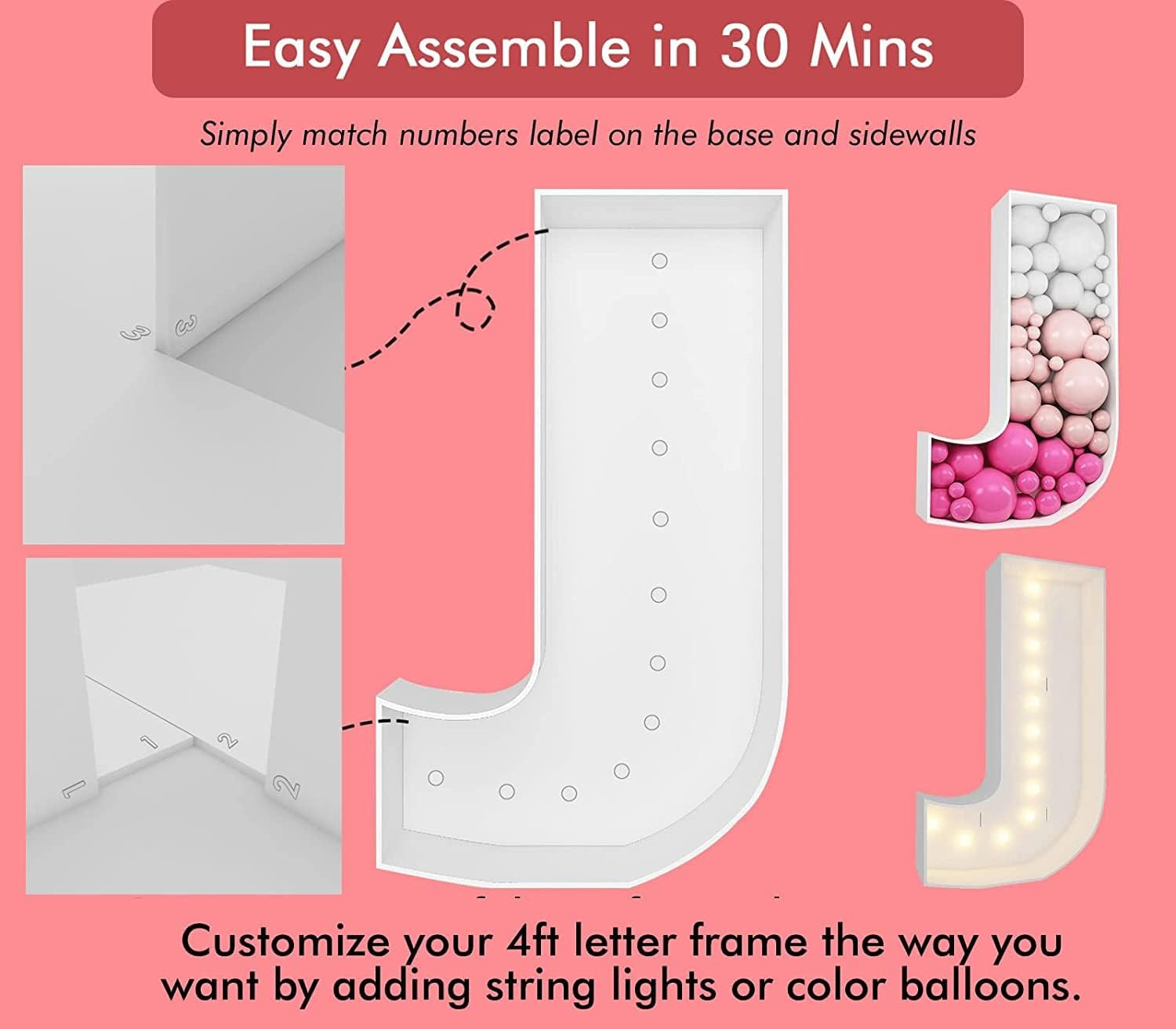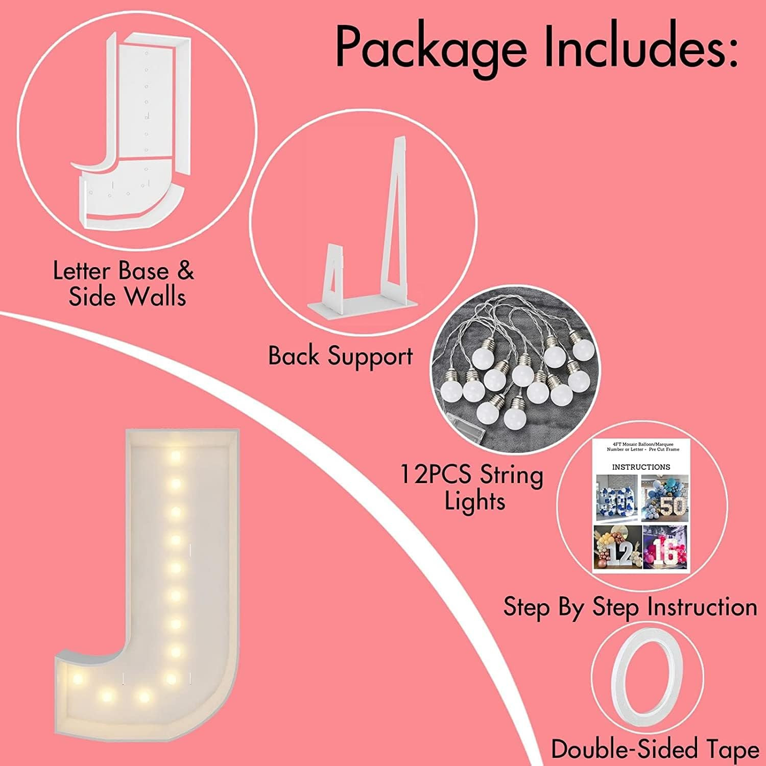 Marquee Light Up Letters, 4FT Marquee Letters J, Mosaic Letters for Balloons, Mosaic Balloon Frame, Giant Cardboard Letters for Birthday Engagement Wedding Party Decoration, Balloon Arch Kit