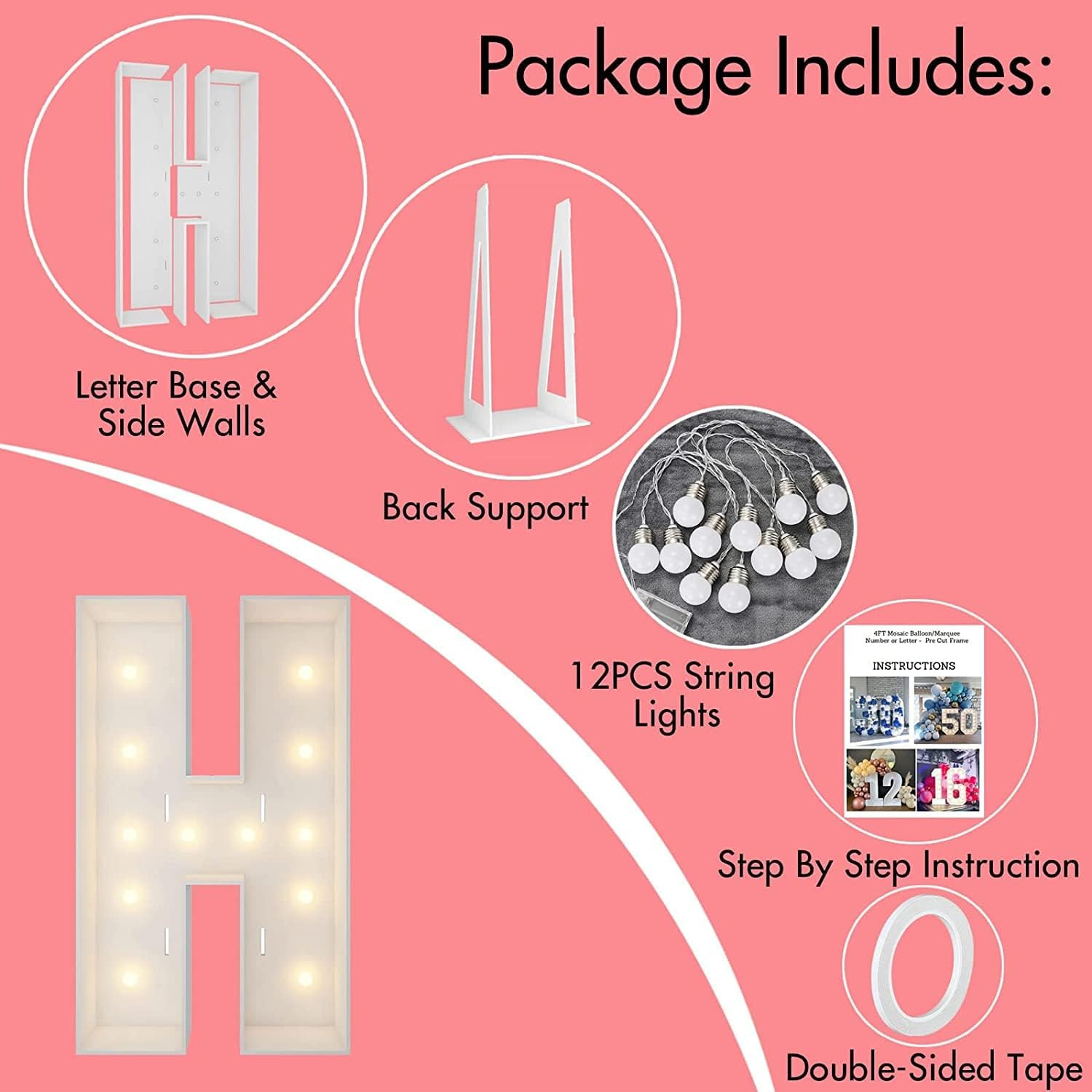 Marquee Light Up Letters, 4FT Marquee Letters H, Mosaic Letters for Balloons, Mosaic Balloon Frame, Giant Cardboard Letters for Birthday Engagement Wedding Party Decoration, Balloon Arch Kit