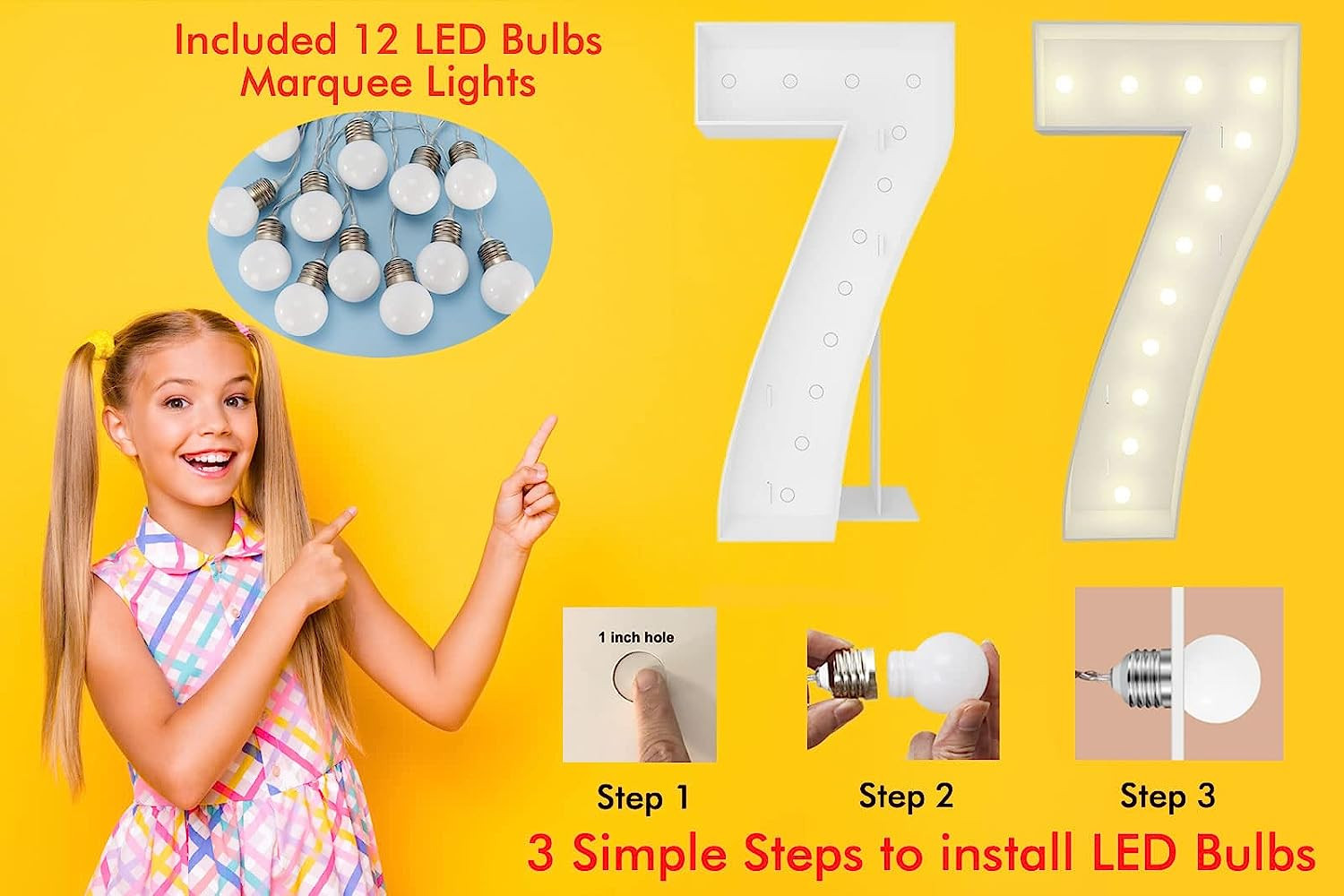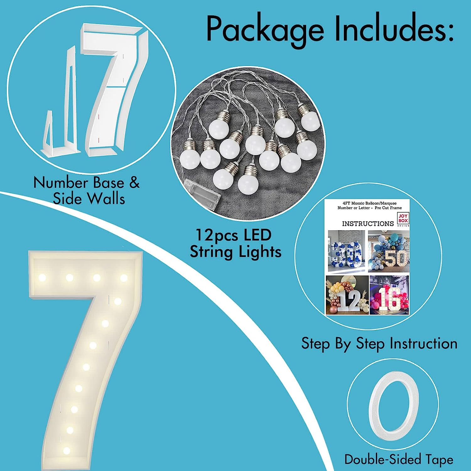 【PACKAGE CONTENTS】4FT Marquee light-up numbers pre-cut kit is ready to be assembled. All you need is a hot glue gun, This pre-cut kit comes with a 4ft number sculpture, side walls, dual back support, 12pcs marquee string lights, and double-sided tape, along with our step-by-step instructions.(Video instruction available)