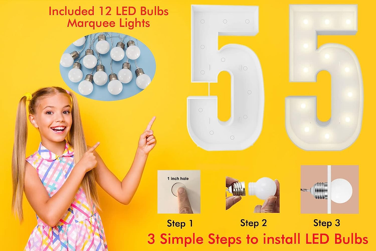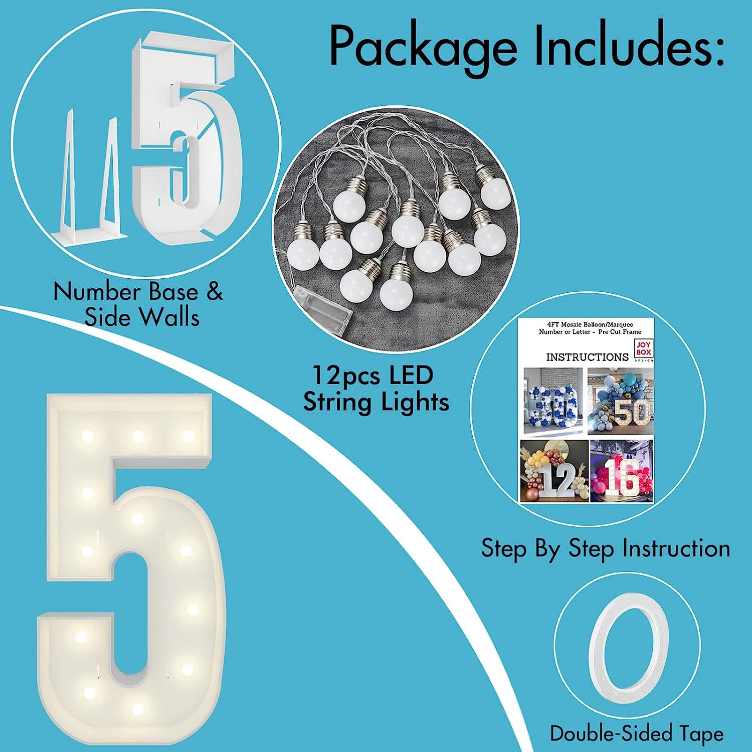 【PACKAGE CONTENTS】4FT Marquee light-up numbers pre-cut kit is ready to be assembled. All you need is a hot glue gun, This pre-cut kit comes with a 4ft number sculpture, side walls, dual back support, 12pcs marquee string lights, and double-sided tape, along with our step-by-step instructions.(Video instruction available)