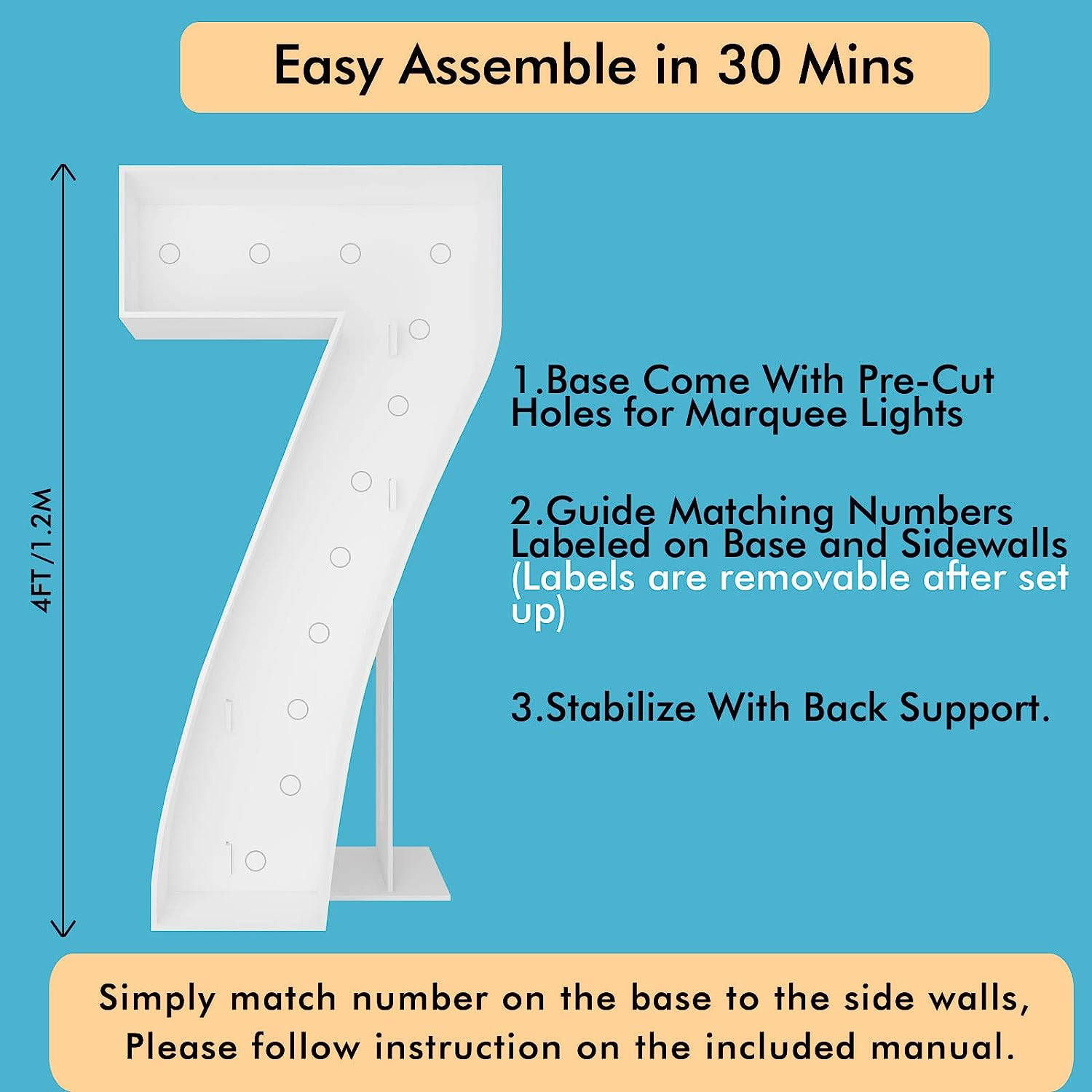 【PACKAGE CONTENTS】4FT Marquee light-up numbers pre-cut kit is ready to be assembled. All you need is a hot glue gun, This pre-cut kit comes with a 4ft number sculpture, side walls, dual back support, 12pcs marquee string lights, and double-sided tape, along with our step-by-step instructions.(Video instruction available)